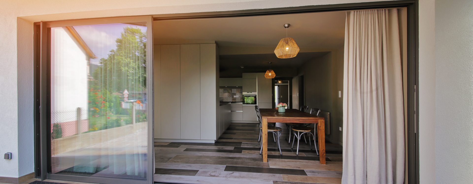 Le coulissant à galandage CG70 Élégance : le jardin dans votre séjour ! Les vantaux s’intègrent et se glissent avec élégance dans les cloisons. L’ouverture maximale du coulissant offre un gain optimal de la lumière dans votre intérieur, et un accès entièrement dégagé sur l’extérieur..